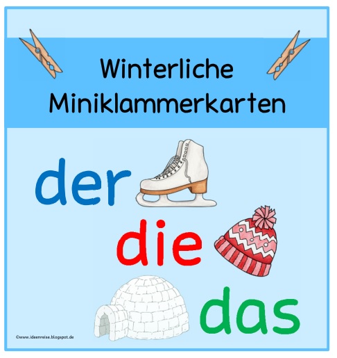 Nun sind auch endlich die Miniklammerkarten zum Winter fertig. Wie bereits bei den anderen Materialien dieser Art soll hier immer der richtige Artikel zum Wort/Bild bestimmt werden. Die Miniklammerkarten können für DaZ oder auch einfach so zum Üben eingesetzt werden. Die Datei enthält winterliche und weihnachtliche Begriffe. Allerdings habe ich die weihnachtlichen Begriffe ans Ende der Datei gesetzt. So kann man sie bei Bedarf auch weglassen. Die Miniklammerkarten ausdrucken und zum Bedrucken mit der Lösung wieder in Pfeilrichtung in den Drucker einlegen. Man braucht also nicht mehr so viel schnippeln 😉