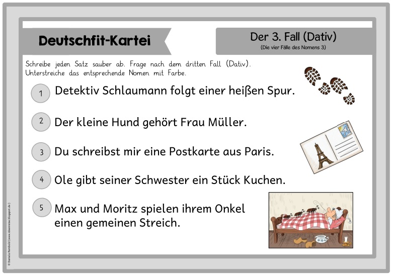 Der fünfte Teil der Deutschfit-Kartei beschäftigt sich mit den vier Fällen des Nomens. Die Datei beinhaltet wieder 6 Karten mit verschiedenen Übungen rund um die vier Fälle. Viel Freude mit dem neuen Deutschmaterial und euch allen einen entspannten Sonntag!