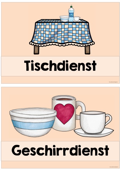 auch hier hast du ganz tolle Schilder erstellt. 🙂 Ich könnte noch sehr gut einen „Frühstücksdienst“ gebrauchen. Wir frühstücken nämlich alle immer zusammen an einem großen runden Tisch und der sieht oftmals danach nicht mehr so sauber aus 😀 Also falls du irgendwann mal wieder an den Dienstschildern sitzt, würde ich mich sehr darüber freuen.
